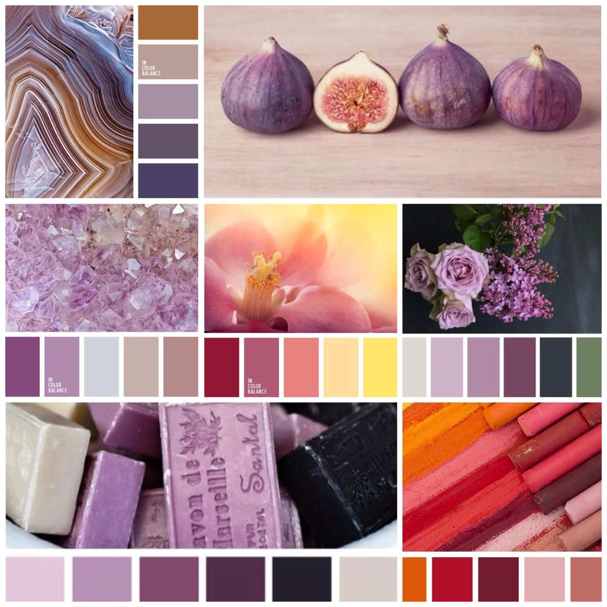 Фиолетовый сочетается с бежевым: светлым желто-бежевым, светлым персиково-бежевым, средне-оранжево-бежевым, средне-розово-бежевым, средне-коричнево-бежевым. Поддерживающая палитра: светло-кремовый, зеленовато-серый, ярко-черный.Ярко-фиолетовый сочетается с бежевым: светло-желто-бежевым, средним персиково-бежевым, темным персиково-бежевым, темным розово-бежевым, темным коричнево-бежевым. Базовые цвета: кремово-белый, платиновый, черно-серый.Серо-фиолетовый сочетается с бежевым: светло-персиково-бежевым, средним лилово-бежевым, средним нейтрально-бежевым, темным розово-бежевым, темно-коричнево-бежевым. Нейтральные: кремово-серый, серебряный, мокрый асфальт.Баклажановый сочетается с бежевым: светло-персиково-бежевым, средним оранжево-бежевым, средним зелено-бежевым, средним розово-бежевым, темным коричнево-бежевым. Поддерживающие цвета: нежно-кремовый, мышиный, ярко-черный.