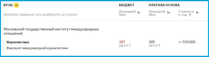 Итак, каждый из них мы подробно тестировали, в скриншотах вы увидите, как выглядит результат поиска на каждом из сайтов. Для примера мы решили поискать себе вуз в Москве для будущего журналиста. Баллы брали средние – по всем трём предметам (русский язык, литература, иностранный язык) вводили цифру 80.