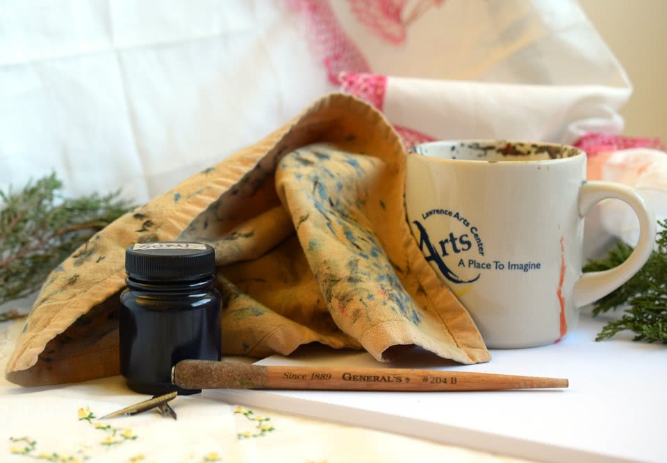 Ваши чернила должны быть помещены в бутылочку с широким горлышком или в банку, чтобы вы не касались ее сторон пером. И поставьте бутылочку туда, где вы не сможете ее легко опрокинуть. В основном, ваши рабочие инструменты должны быть в пределах досягаемости, но все же на безопасном расстоянии. Например, мы помещаем их в рулон ленты или даже закрываем их, чтобы избежать риска.