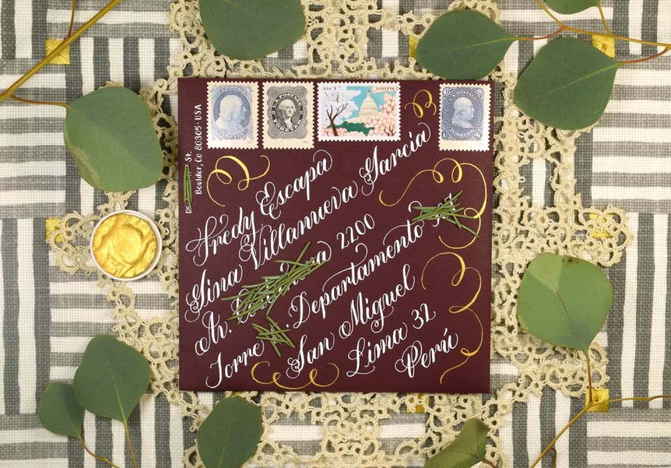 - Свадебная атрибутика. Пригласительные, план рассадки гостей, нумерация столиков – все это можно исполнить в едином стиле, применив каллиграфию. Это добавит празднику индивидуальности и подчеркнет общую концепцию торжества: