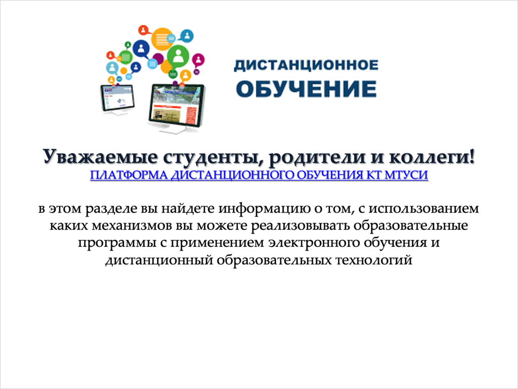 Приказ № 17-0 от 22.01.2021 г. «О проведении учебных занятий по программам среднего профессионального образования в КТ МТУСИ по очной форме обучения»Приказ № 01-03-10 от 22.01.2020 г. «О возобновлении проведения учебных занятий обучающимися Колледжа телекоммуникаций МТУСИ по очной форме обучения, осваивающими программы среднего профессионального образования»