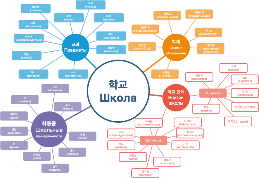 Майнд-карта, интеллект-карта, диаграмма связей — способ, который помогает структурировать большие объемы слов по группам. Давайте рассмотрим более подробно на примере слов на тему «школа». Поместим в центр карты слово 학교 и проведём 4 стрелки: 교과 (предмет), 학제 (система образования), 학용품 (школьные принадлежности), 학교 안에 (внутри школы).