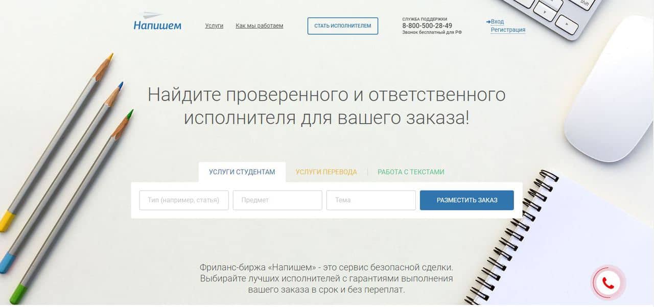 Фриланс-биржа Napishem.ru значится среди ведущих интернет-проектов в сфере содействия студентам и характеризует себя как сервис безопасных сделок, где безупречно выполненное задание можно получить в сжатые сроки и без посредников. Сделав заявку с указанием темы, объема и иных требований, пользователь затем выбирает актуальный вариант в соотношении «цена-качество» из предложений, поступивших в личный кабинет от различных экспертов. Чтобы определиться с исполнителем, можно изучить рейтинг и отзывы или обратиться к представителю менеджмента. Этот подход действует при выполнении и небольших лабораторных, и остро востребованных рефератов, контрольных, курсовых, и монументальных дипломных или диссертаций. Биржа гарантирует клиентам конфиденциальность, финансовую безопасность и, главное, высококачественный уровень – прежде чем начать сотрудничать с ресурсом, будущие исполнители проходят тщательную многоступенчатую проверку на профпригодность.