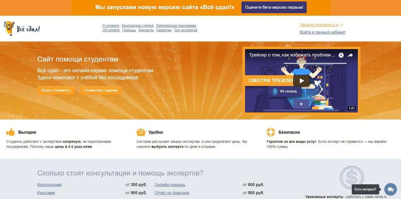 Привлекательный и доступный внешний вид интернет-платформы Vsesdal.com вполне коррелирует с уровнем предлагаемых услуг. Почти 7,5 тыс. топ-экспертов в рамках сотрудничества с порталом оказывают помощь с заданиями различной степени сложности. Процесс поиска автора-исполнителя прост: клиент размещает заявку, сервис рассылает ее экспертам, которые делают затем предложение с указанием стоимости. Далее потребитель выбирает будущего «гуру», досконально изучив его профиль на предмет специализации, отзывов, статистики. Интересы заказчика блюдутся посредством функции «безопасная сделка» – деньги хранятся на балансе, автор получает их только после успешной сдачи работы.