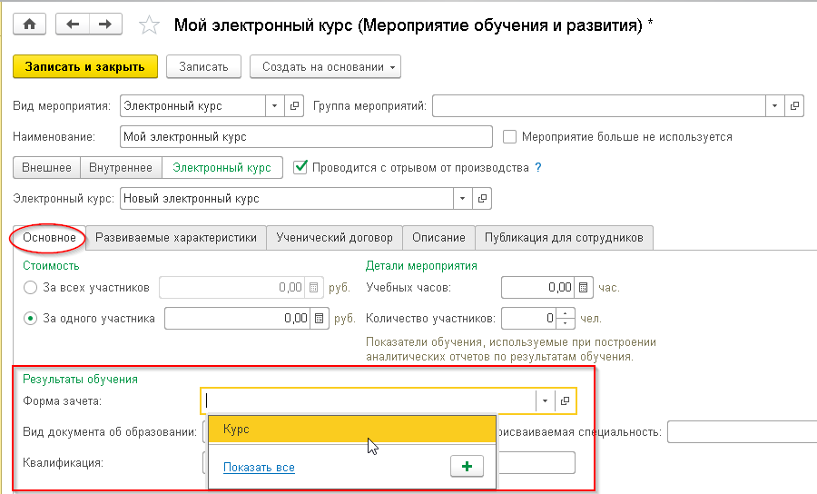 В документе «Мероприятие обучения и развития», на вкладке «Основное» — «Результаты обучения», в поле «Форма зачета» выберите нужное значение (рис.33)