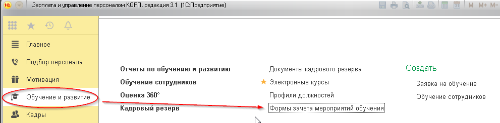 Рис.31. Раздел «Обучение и развитие», «Формы зачета мероприятий обучения» в «1С:ЗУП КОРП»