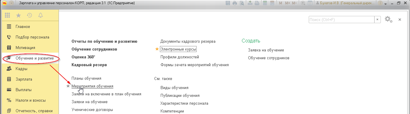 - Перейдите в раздел «Обучение и развитие – Мероприятия обучения» (рис.18).