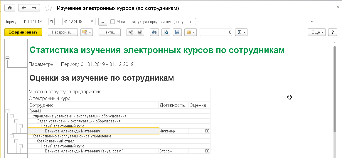В качестве примера сформирован отчет «Изучение электронных курсов (по сотрудникам)» за период.