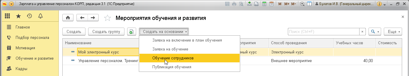 Рис.23. Проведение обучения сотрудников в «1С:ЗУП КОРП»