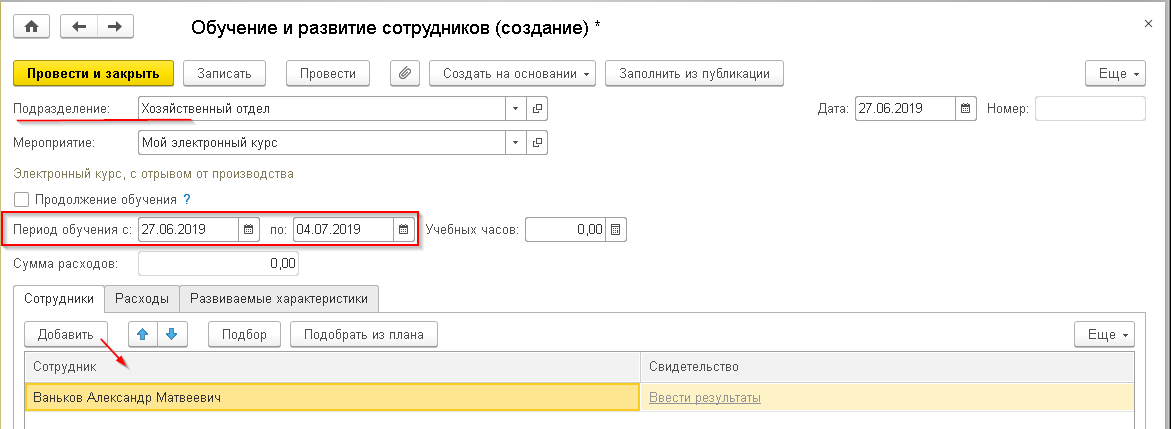 В открытой форме «Обучение и развитие сотрудников» укажите подразделение, период обучения (с…по). В табличной части «Сотрудники» с помощью кнопки «Добавить» или кнопки «Подбор» вы можете «подтянуть «сотрудников, для которых необходимо провести обучение (рис.24)