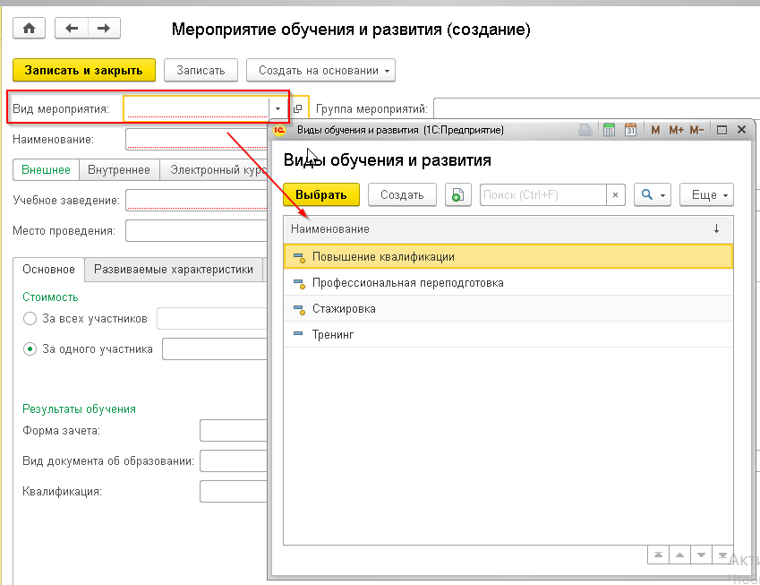 В открытой форме выберите вид мероприятия (при необходимости создайте необходимый вид с помощью кнопки «Создать») из справочника «Виды обучения и развития» (рис.20). Пропишите наименование мероприятия в соответствующем поле.