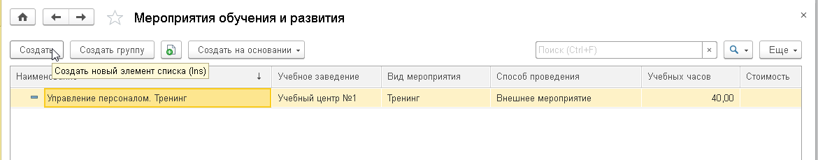 В журнале «Мероприятия обучения и развития» нажмите кнопку «Создать» (рис.19)