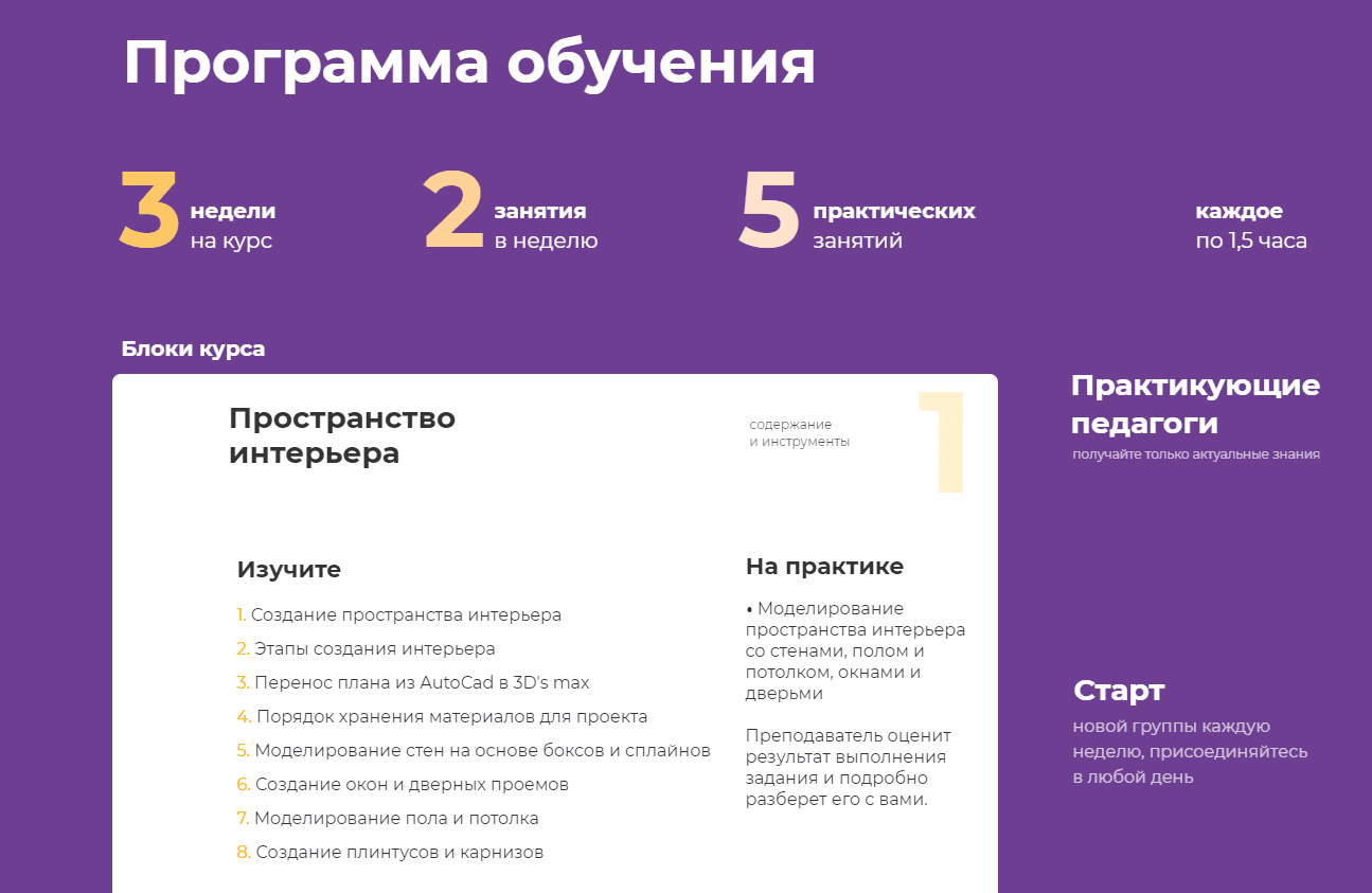 Онлайн-школа периодически анонсирует набор очередного потока на бесплатный курс по моделированию, публикуя мотивационные работы слушателей потока предыдущего. Он включает 4 занятия. На стартовом изучается интерфейс 3ДС Макс, на втором — проектирование геометрической формы сцены, на третьем — композиция и освещение. На последний урок неизменно планируется создание финального рендера.