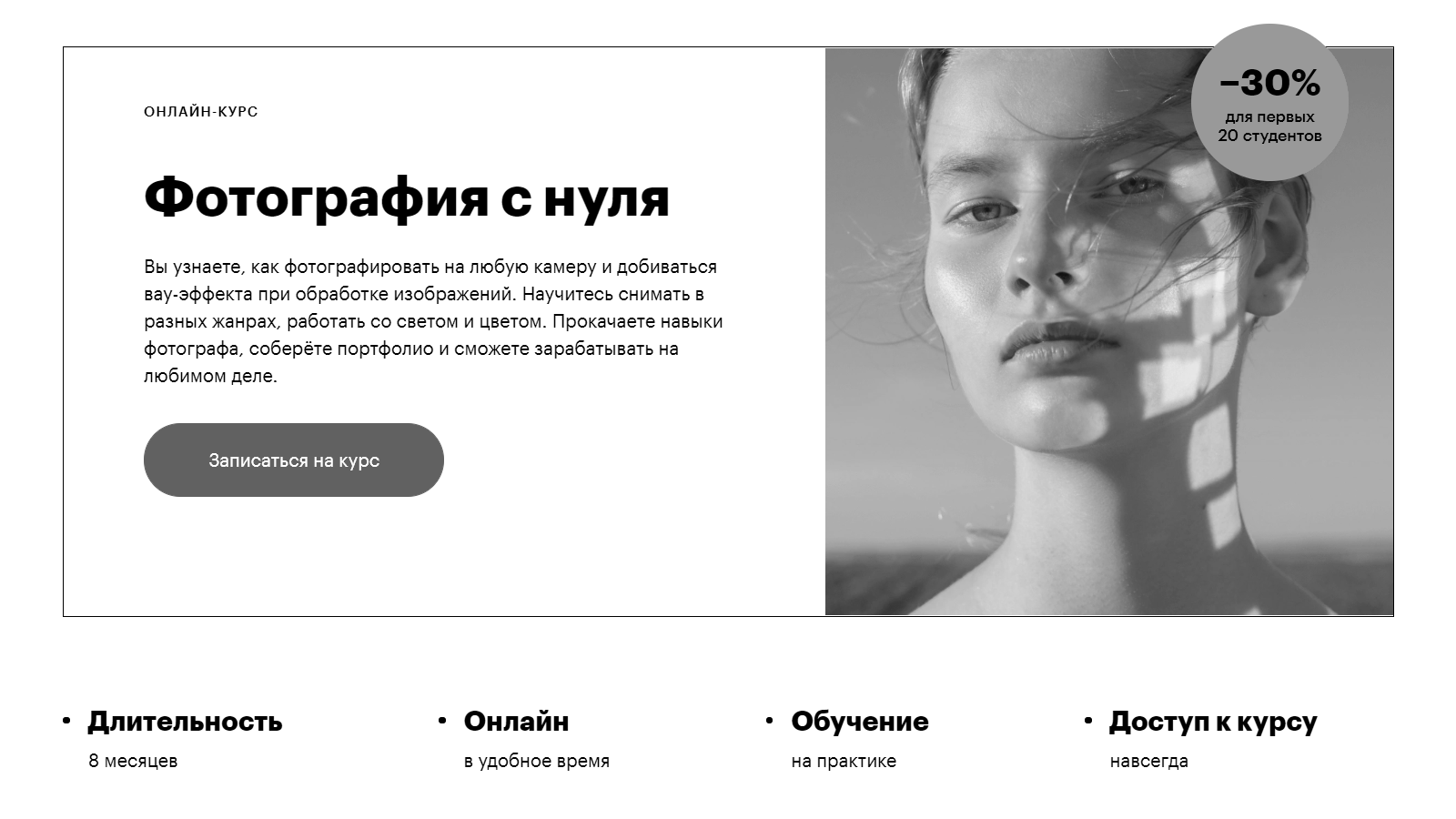 Практические задания с проверкой после каждой темы + съемки с заказчиком. По итогам 30 фотографий в портфолио.