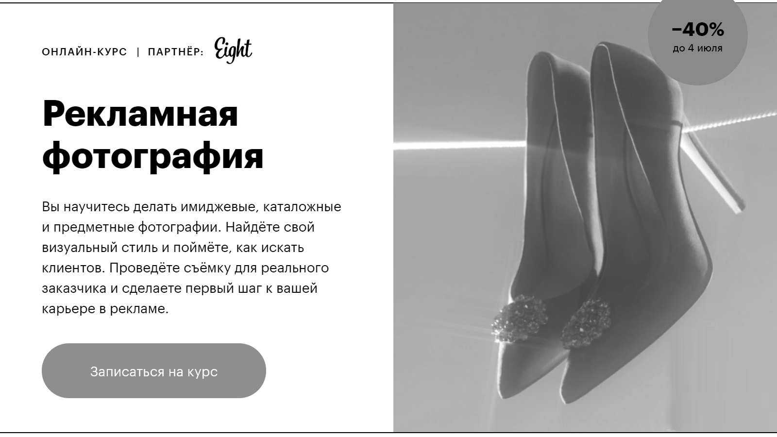 Лучше всего платят за рекламную фотографию. Обучитесь предметной и коммерческой съемке в удобном для себя темпе. На курсе много практики, а в конце защита дипломного проекта. Партнер курса — Eight Agency, ведуще агентство рекламных фото в РФ.