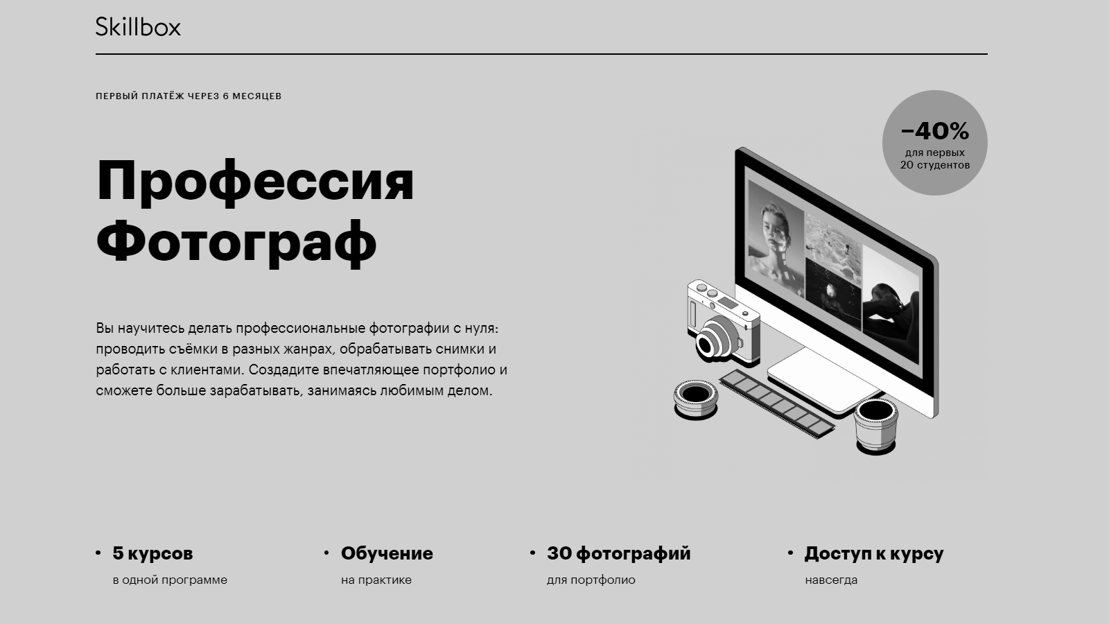 Учиться можно в удобном для себя темпе, совмещая курс с работой. За первые полгода учебы можно заплатить позже. Студентов ждут лекции, практика, воркшопы, съемки. В портфолио будут снимки разных жанров. И диплом поможет найти работу.