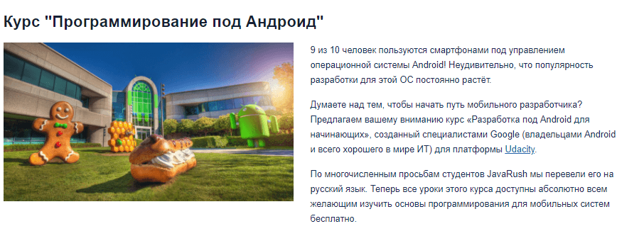 Курс на сайте Javarush.ru на 80% состоит из практики, что необходимо любому программисту, начинающему писать коды. Проект рассчитан на новичков, содержит теоретические материалы и видеозанятия, призванные помочь в изучении основ Java, а также практические задания по созданию простых программ.