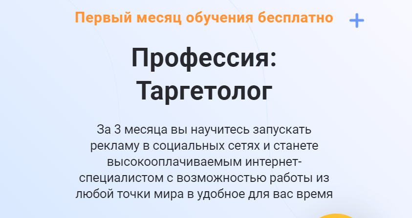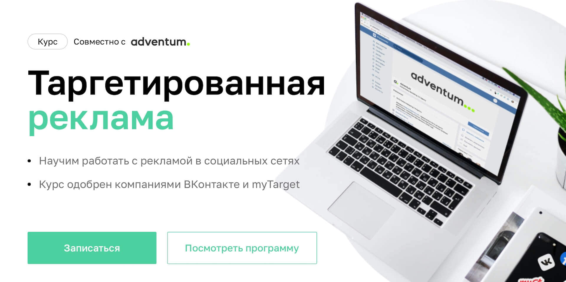 Это лучший курс по таргетированной рекламе в плане поддержки учеников. На курсе рассказывают о работе с таргетом в Инстаграме, Фейсбуке, Одноклассниках, ВКонтакте и ТикТоке. Каждый ученик получает по 4 000 ₽ на рекламу, а тот, кто сделает лучшую дипломную работу, – 15 000 ₽. Также организаторы помогают устроиться на работу и пройти стажировку в агентстве performance-маркетинга Adventum.