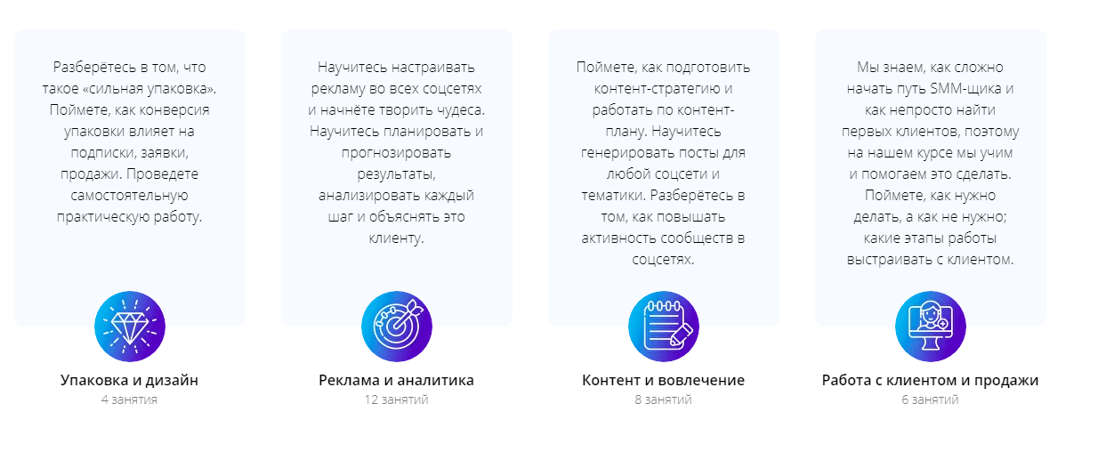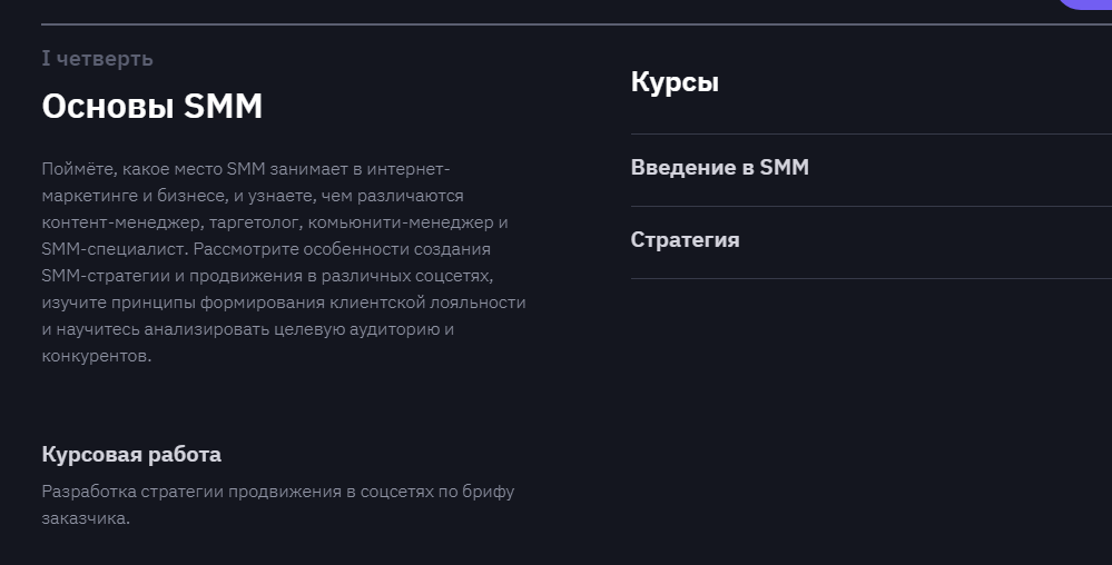 Создатели курса обещают быстрое освоение профессии для новичков и улучшение скила для тех, кто уже работает в маркетинге и интересуется SMM. Программа разделена на несколько блоков, в конце каждого студент пишет курсовую работу.