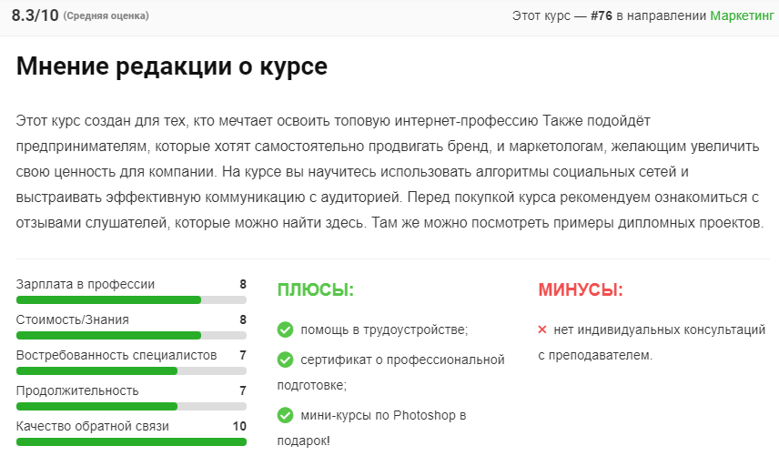 В конце курса Нетология подготовила тест на профориентацию, а также сертификат о прохождении курса. Здесь вы можете ознакомиться с подборкой курсов по таргетированной рекламе: https://tutortop.ru/courses_selection/kursy_po_targetirovannoj_reklame/