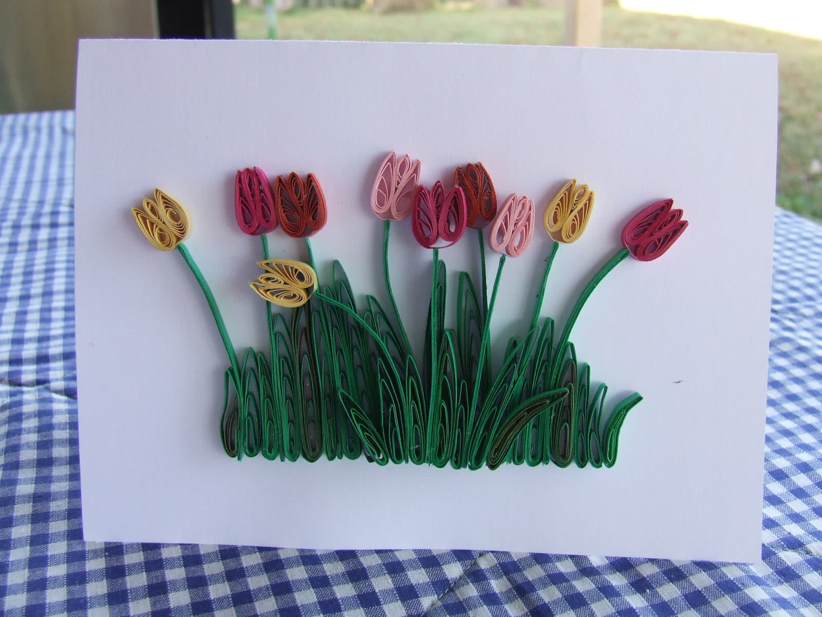 Тюльпан – картон, зубочистка, клей, ножницы, разноцветные линии. Из линий свернуть роллы, склеив края. Должна получиться капля. Для цветка нужно 3. Зеленую полосу в жгут – стебель. Листья – зеленую полосу пополам, срезав низ и зафиксировав его клеем. Собрать композицию, склеив между собой.