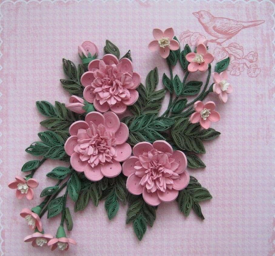 На первом этапе работы в технике квилинг лучше не браться сразу за объёмную сложную композицию, а попробовать сделать отдельные цветки, не прикрепляя их на основу. Такие небольшие поделки могут служить не только подготовкой к более серьёзным изделиям, но и стать отличным сувениром. Объёмные букеты можно составить из цветков, соединяя их проволокой (обычной или флористической).