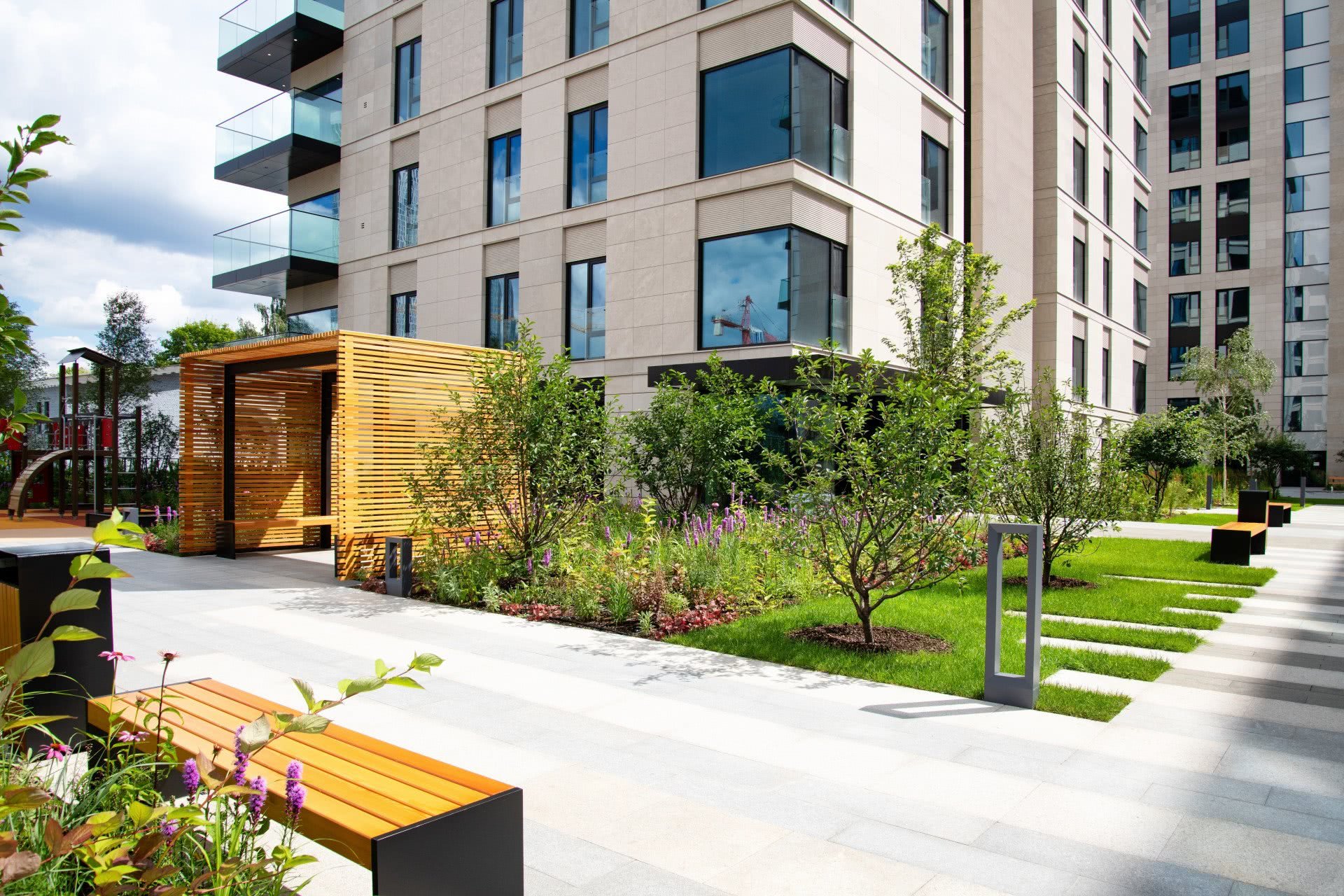Реализованный проект ландшафта жилого комплекса. Дизайнер спроектировал для него и малые архитектурные формы — скамейки и беседки. Фото: DEREVO PARK