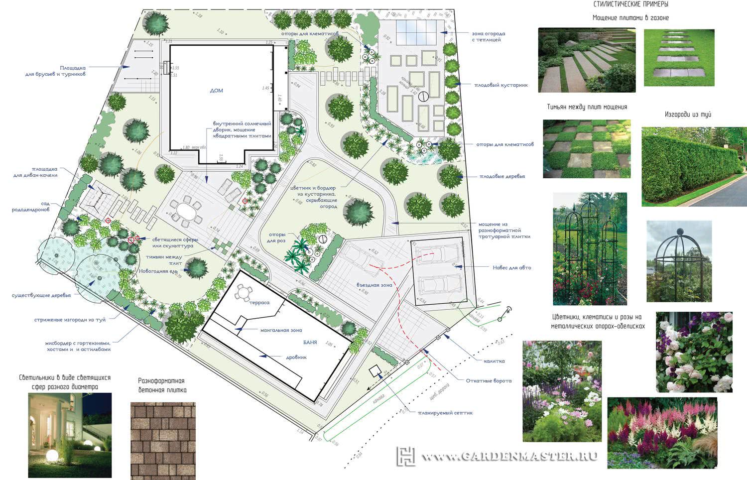 Проектирование участка начинается с разработки художественной концепции и предварительного плана. При этом учитывается, как будут рассажены растения, как они будут сочетаться друг с другом. Например, родственные растения нужно высаживать поблизости друг от друга, потому что без «взаимной поддержки» они будут выглядеть недостаточно пышно, а в облике участка останется какая-то незавершённость. Но слишком тесная посадка не даёт растениям как следует развиваться.