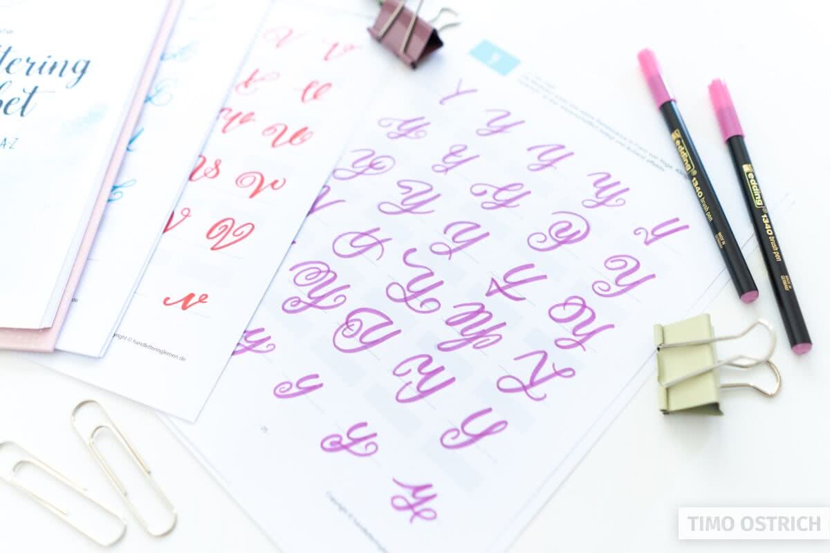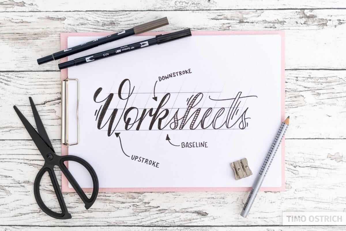 The most effective way of learning hand lettering, brush lettering and calligraphy is to use templates and worksheets. Guides and premade lines will help you to concentrate on your pens and the different strokes.