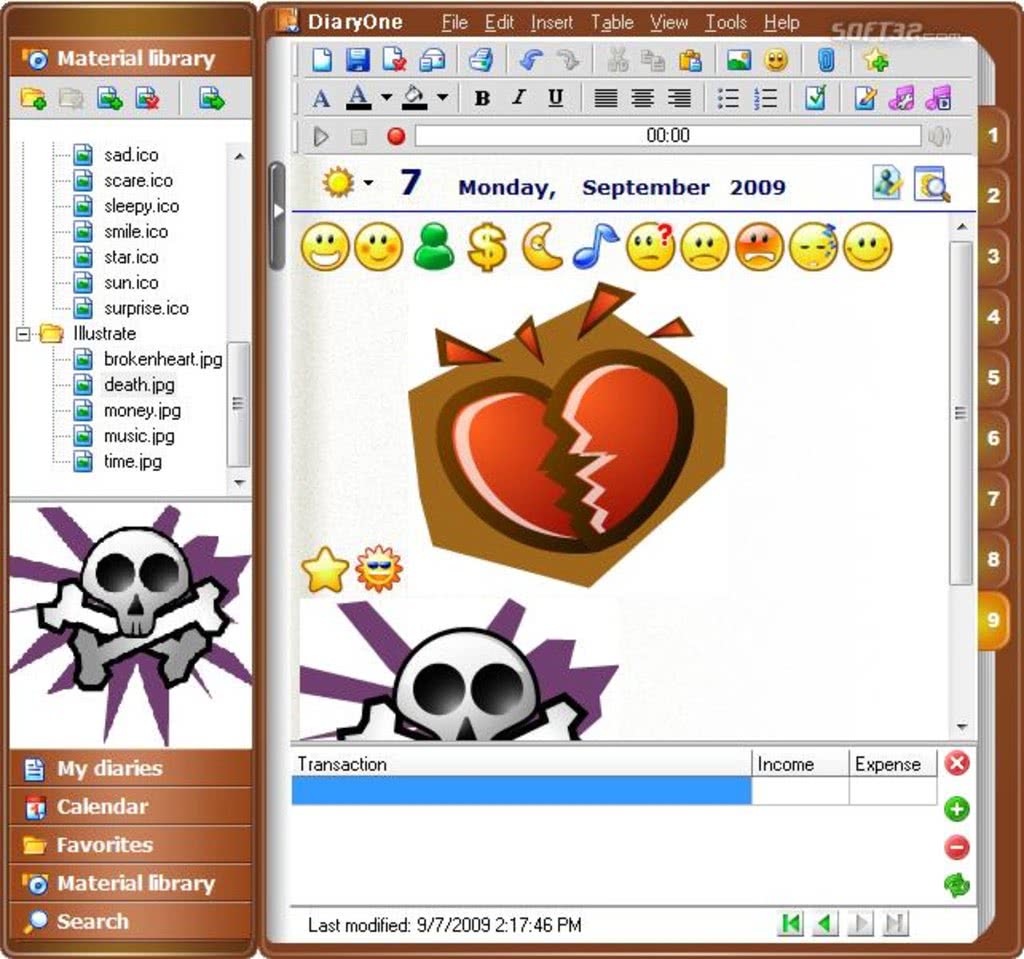 Это классическая утилита для ведения дневника. В ней можно создавать не только текстовые, но и голосовые записи. Отметим, что в текст можно добавлять различное содержимое: анимированные смайлики, таблицы, музыку. Создавая запись в дневнике, можно указывать текущую погоду, сведения о расходах, доходах. Есть в утилите разные варианты дизайна рабочей области.