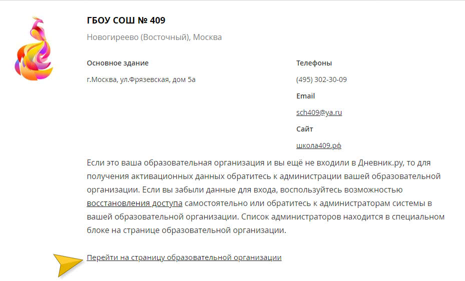 2. На втором шаге человек попадает на главный сайт того учреждения, на котором он остановил выбор. Завершение регистрации произойдёт, когда регистрируемый сделает запрос в администрацию школы/гимназии. Все контакты указаны на сайте. Представители учреждения активируют данные пользователя.