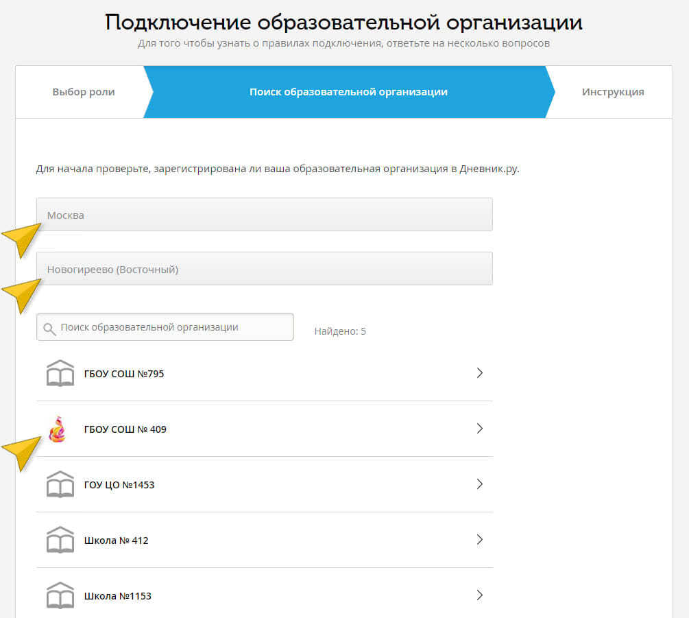 Заполнение формы: Укажите город и район, выберите образовательное учреждение