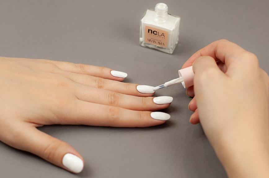 - Нанести базу, высушить. Затем окрасить ноготь выбранным оттенком лака в два слоя. В нашем случае это ярко-белый цвет, на нем выбранный рисунок будет смотреться наиболее эффектно. Не стоит заморачиваться над тем, чтобы лак лег ровно без проплешин. После нанесения картинка скроет все недостатки. Слой лака должен хорошо высохнуть. Дождитесь естественного высыхания или используйте специальный состав для быстрой сушки.