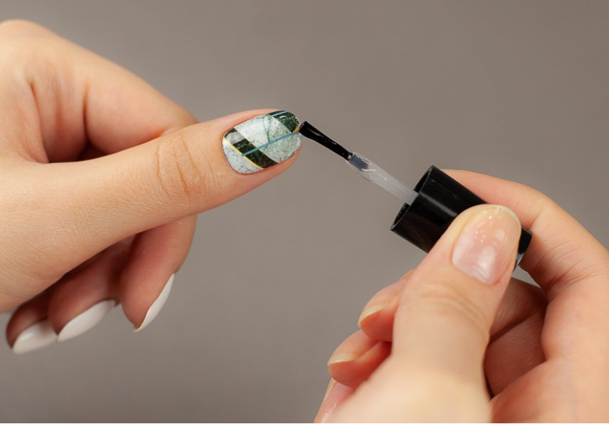 Покрыть ногтевую пластинку лаком, дать ему чуть-чуть подсохнуть
