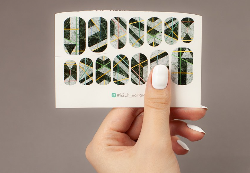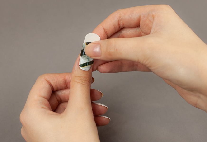 - Сразу слои не разделяют. Целый слайдер берут двумя пальцами — большим и указательным. Подносят к выбранному ногтю. Затем большим сдвигают пленочный рисунок к лунке, указательным — основу к краю ногтя. Иногда рекомендуется использовать для разделения пинцет. Он поможет разделить слои, но наносить пленку на пластину с его помощью сложно — образуются морщины, загибы. Расправить их крайне сложно.