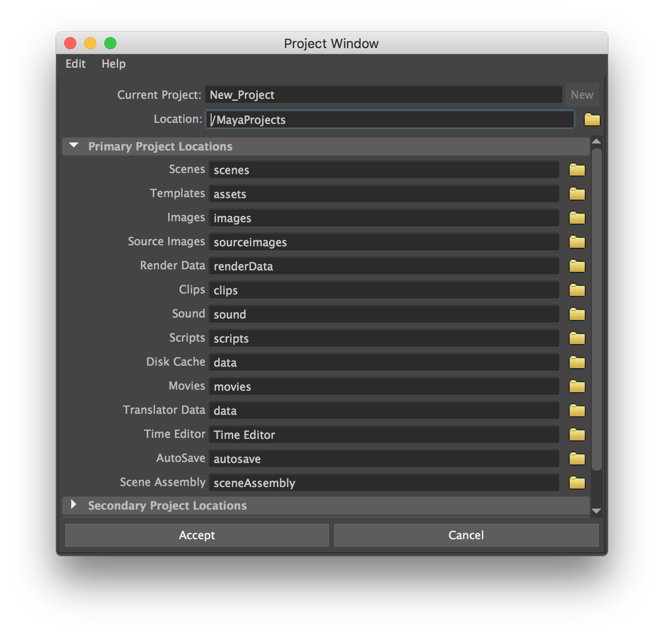In the section called Primary Project Locations is a list of the names of the folders (directories) that Maya uses inside the project locations. These locations determine where Maya will look for certain files. To modify these locations, do one of the following: