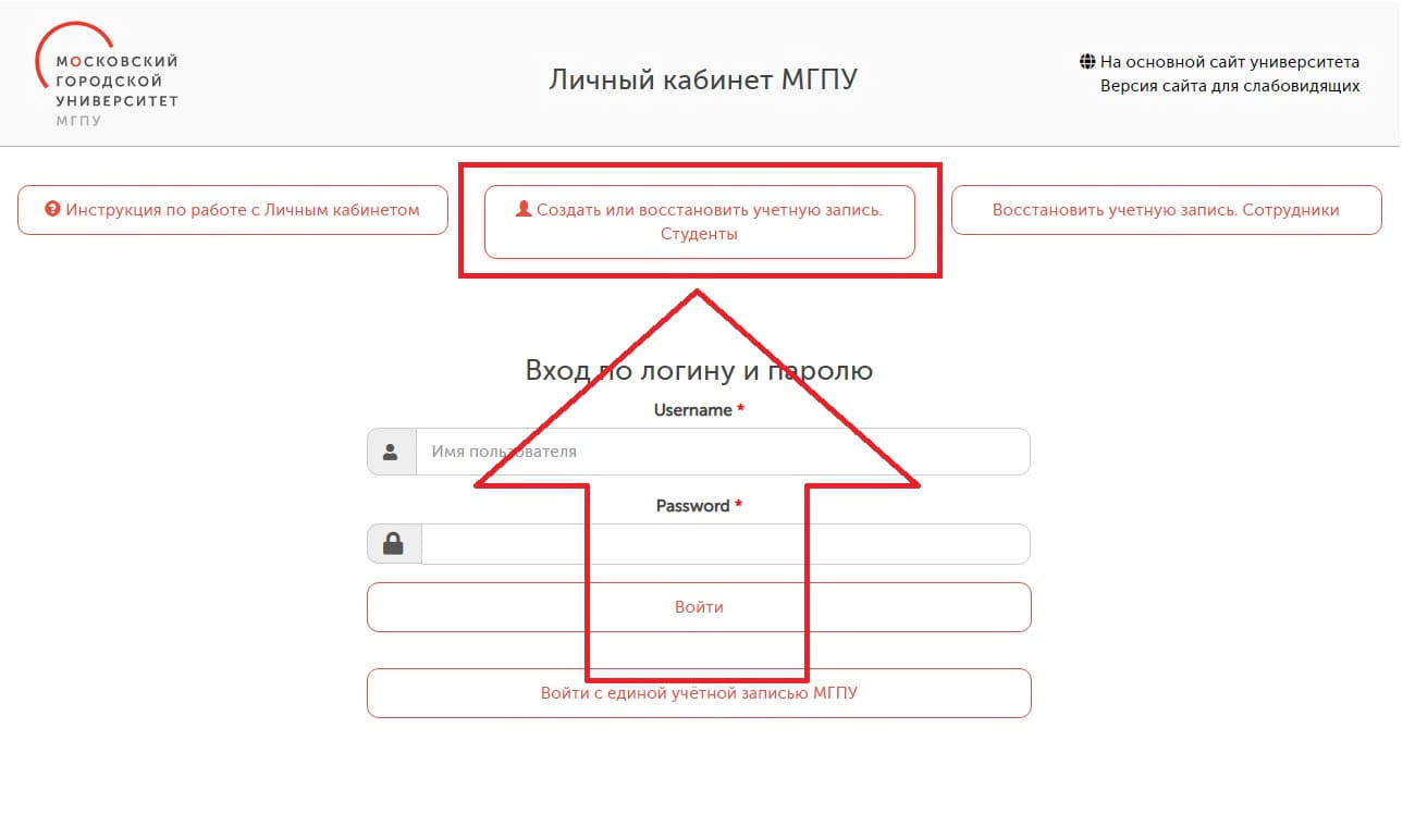 - Вы попадете на страницу для входа в личный кабинет МГПУ. Сверху над формой авторизации нажмите на кнопку «Создать или восстановить учетную запись. Студенты».
