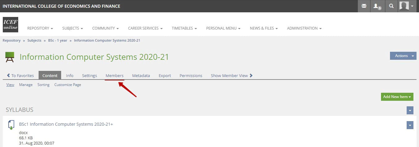 Кроме того, проверить списки студентов можно через ICEF Online в разделе Subjects, выбрав нужный курс и предмет и перейдя во вкладку Members.