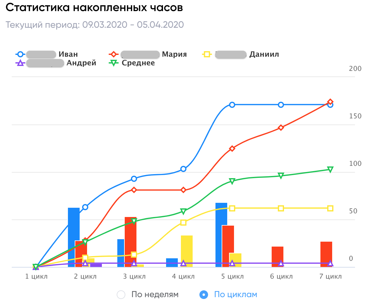 Статистика отображается в виде графика. По горизонтальной оси расположены циклы или недели, по вертикальной — количество часов, набранное к данному моменту. Чем более здорово (планомерно) идет работа в проекте, тем равномернее график каждого участника идет вверх.