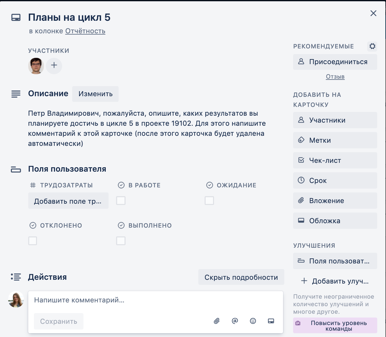 Вот такую карточку создаст бот в начале цикла. Здесь руководитель должен написать в текстовом поле внизу (в разделе «Действия») ожидаемые результаты проекта за цикл и нажать «Сохранить». После получения ответа, бот удалит карточку.