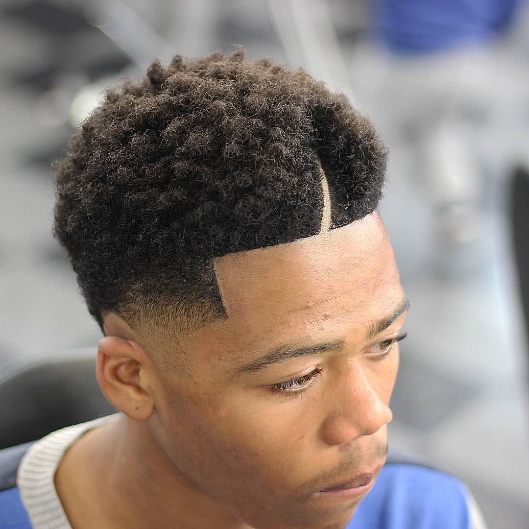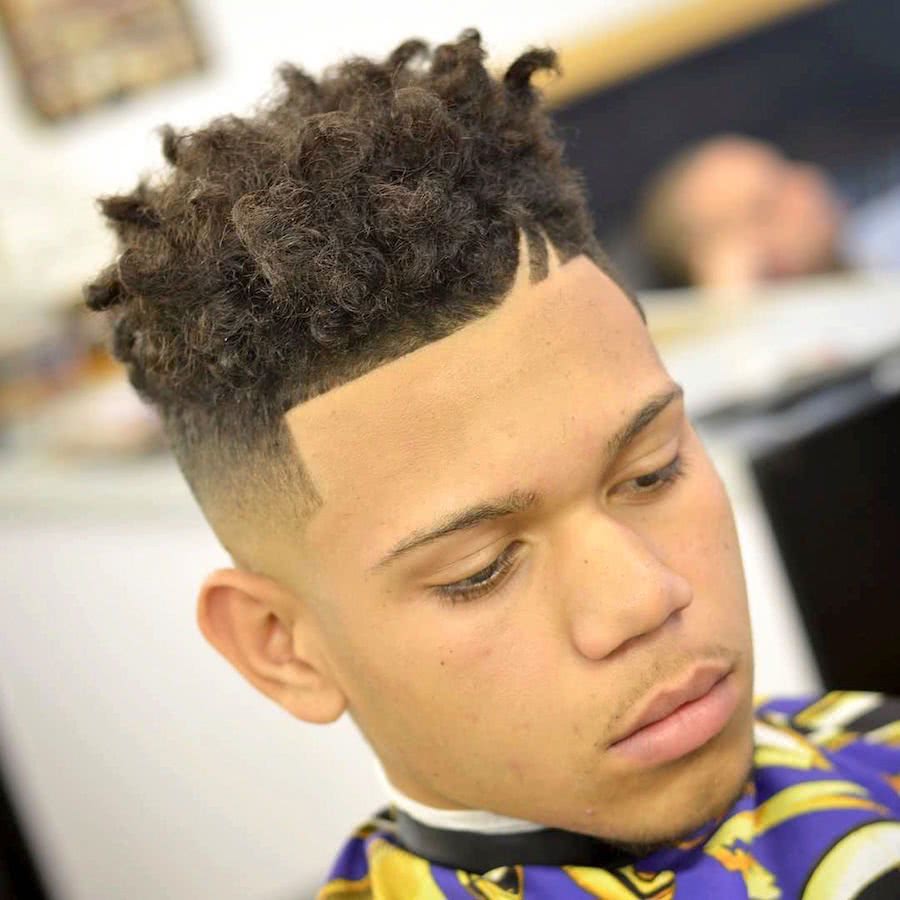 Одна из самых любимых причесок для чернокожих мужчин. Плавное переход сохраняет свежий и опрятный внешний вид, естественные вьющиеся волосы на вершине скручены в завитки.