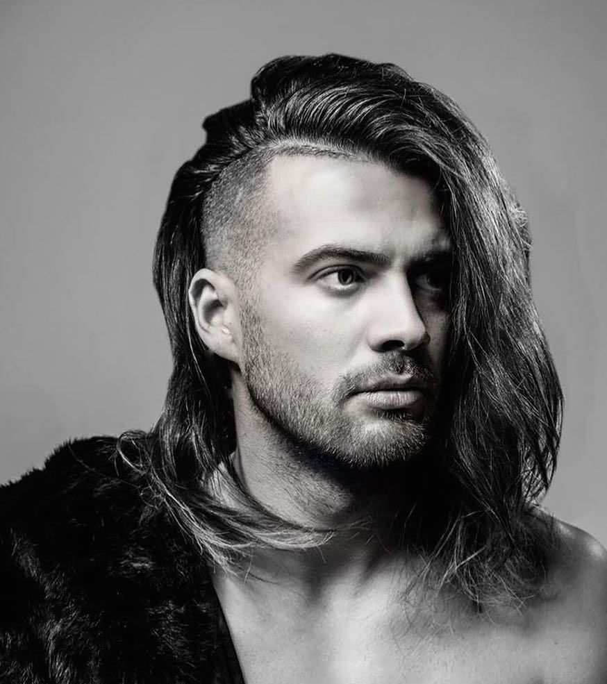 Одна из самых заметных мужских стрижек в этом году. Выбритые стороны резко контрастируют с длинными волосами на вершине головы.