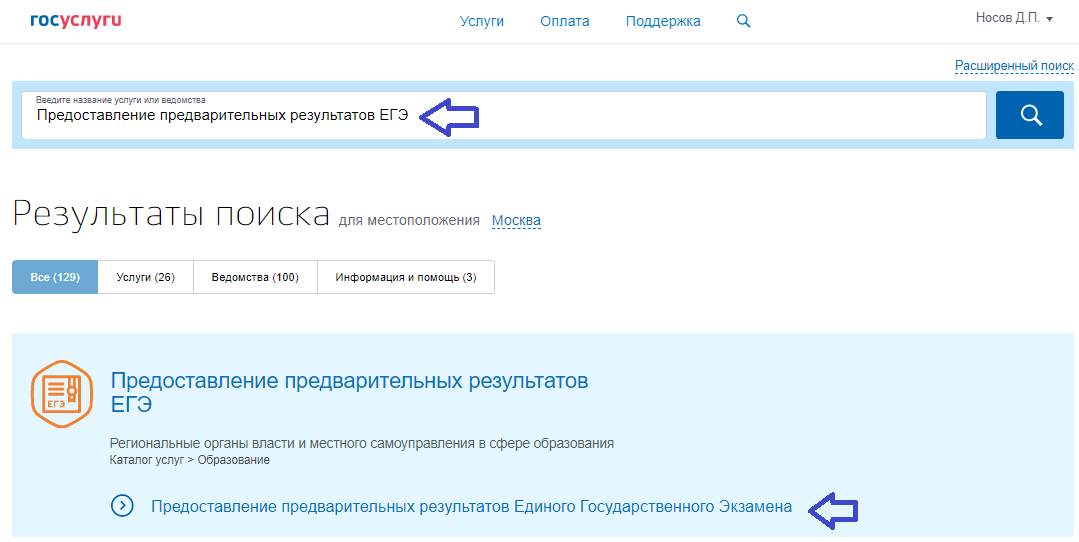 Для получения информации по результатам ЕГЭ вбиваем в поиске на портале Госуслуги запрос «Предоставление предварительных результатов ЕГЭ».