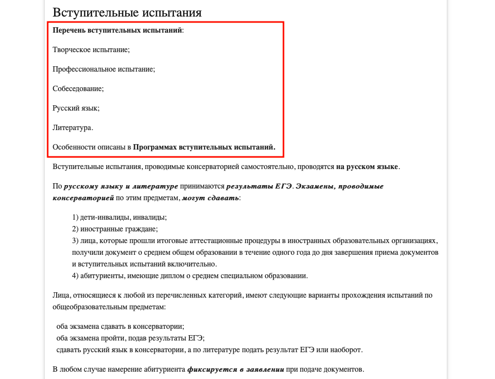Для музыкального направления естественно наличие дополнительного экзамена, который оценивает способности абитуриентов. Каждый вуз здесь устанавливает свои правила, регламентируемые приемной комиссией. Рекомендуем ознакомиться с ними заранее на сайте приемной комиссии и готовиться по рекомендуемой вузом программе.