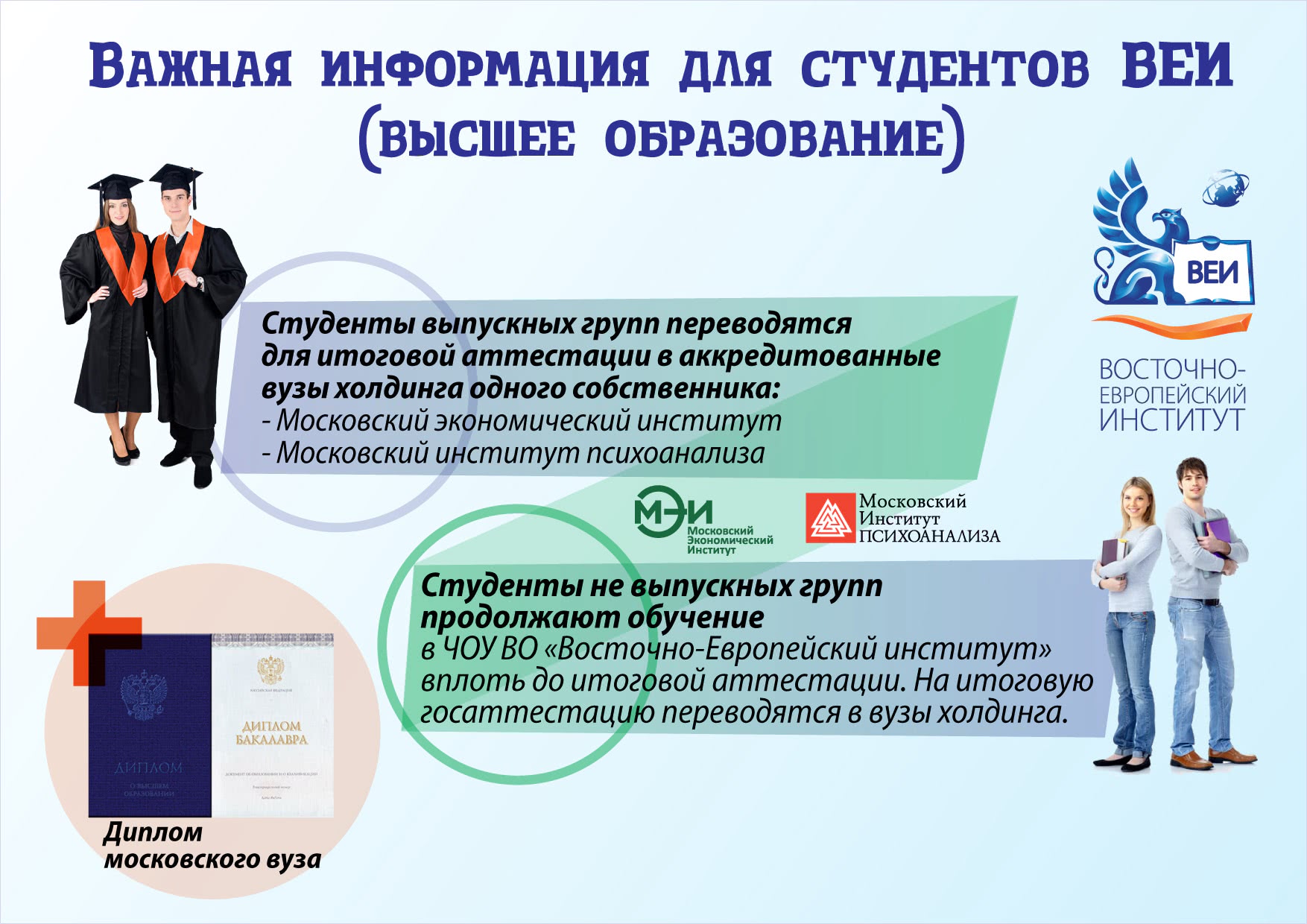 ЧОУ ВО «Восточно-Европейский институт» работает в штатном режиме, в прежнем составе. Просим вас сохранять спокойствие и продолжать обучение. Студентов Высшего юридического колледжа и Высшего инженерного колледжа, получающих среднее профессиональное образование, ситуация с институтом не коснется. И ВЮК, и ВИК представляют отдельные юридические лица, у каждого из них есть лицензия на образовательную деятельность и государственная аккредитация http://www.mveu.ru/about/license.php