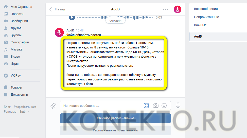 Самый простой и быстрый путь узнать, какая музыка или песня играет в видео из ВК, — использовать интерактивный онлайн-сервис, или попросту бот, распознающий звуковые сообщения.