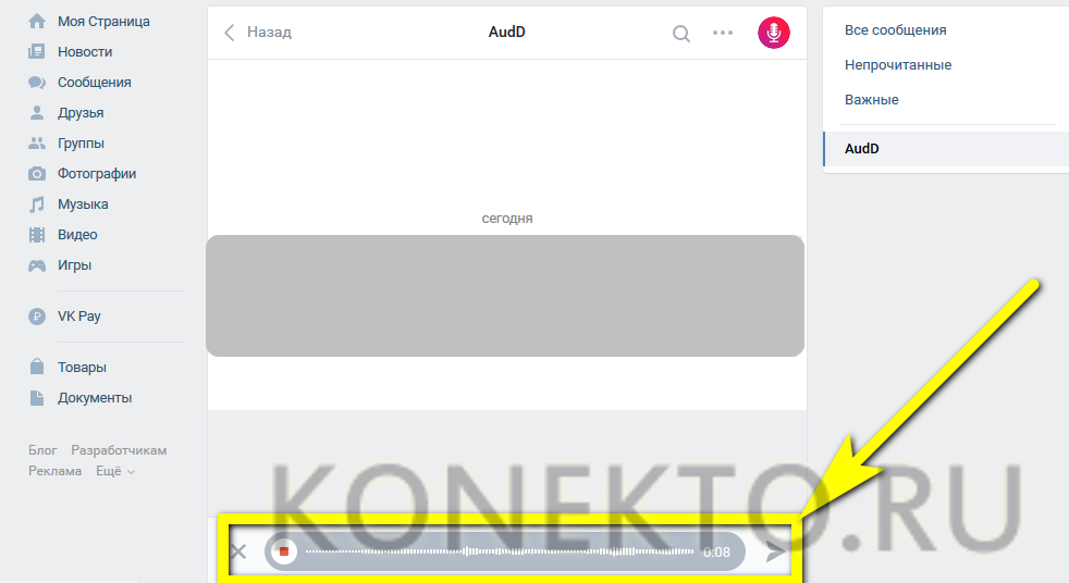 Если есть возможность включить интересующую музыку из видео с мобильного устройства или другого компьютера или ноутбука, нажать на кнопку-микрофон и записать для бота восьми-десятисекундное голосовое сообщение.