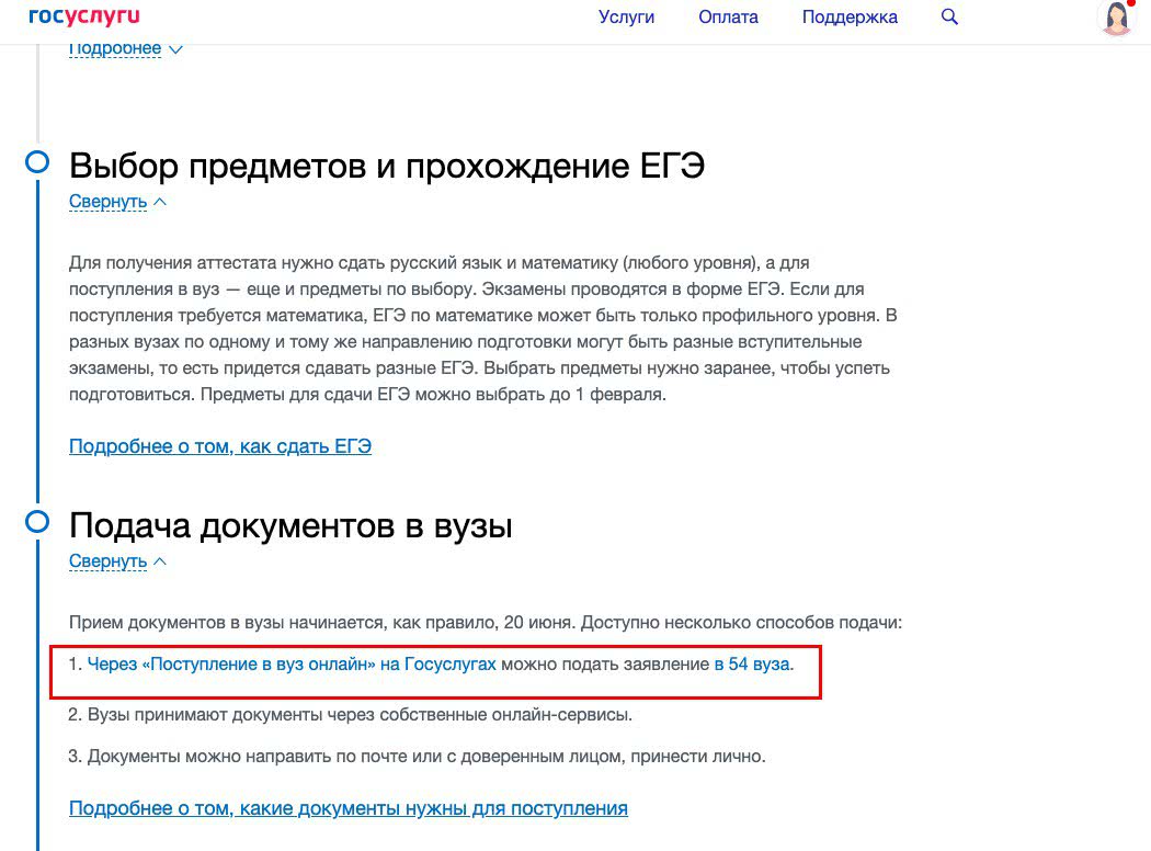 - В графе «Подача документов в вузы» нажать на ссылку «через «Поступление в вуз онлайн» на Госуслугах».