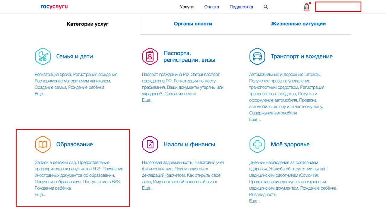 - Найти в профиле отдел «Все услуги» и через него перейти в окошко «Образование»;