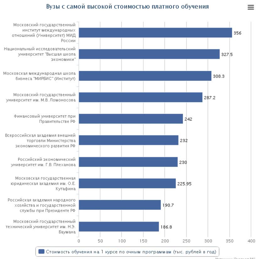 Стоимость одного года обучения в МГУ, НИУ ВШЭ, СПбГУ – 300 000 рублей, в вузах попроще – около 150 000 рублей